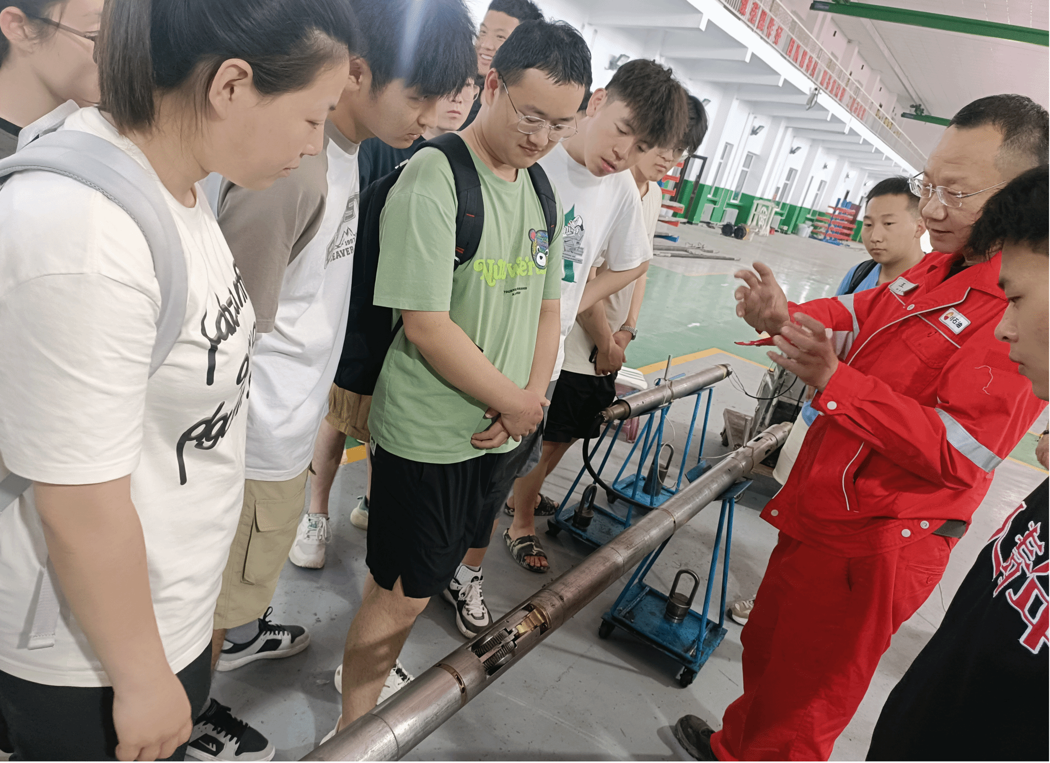 在中油测井大庆分公司,同学们与现场操作人员进行了零距离的沟通交流,体验测井流程,并亲眼见到了课堂上所学的测井仪器,这不仅加深了他们对先进测井技术的理解,也激发了他们对专业的兴趣;通过现场测井解释工程师的讲解,同学们深入了解了测井技术发展现状及工作流程,为他们未来的职业发展奠定了坚实的基础;在仪器维修中心,工程师展示了测井仪器的维修保养过程,通过对核磁、电成像、阵列声波等先进测井仪器的深入讲解,学生们将理论与实践相结合,真正做到学以致用。