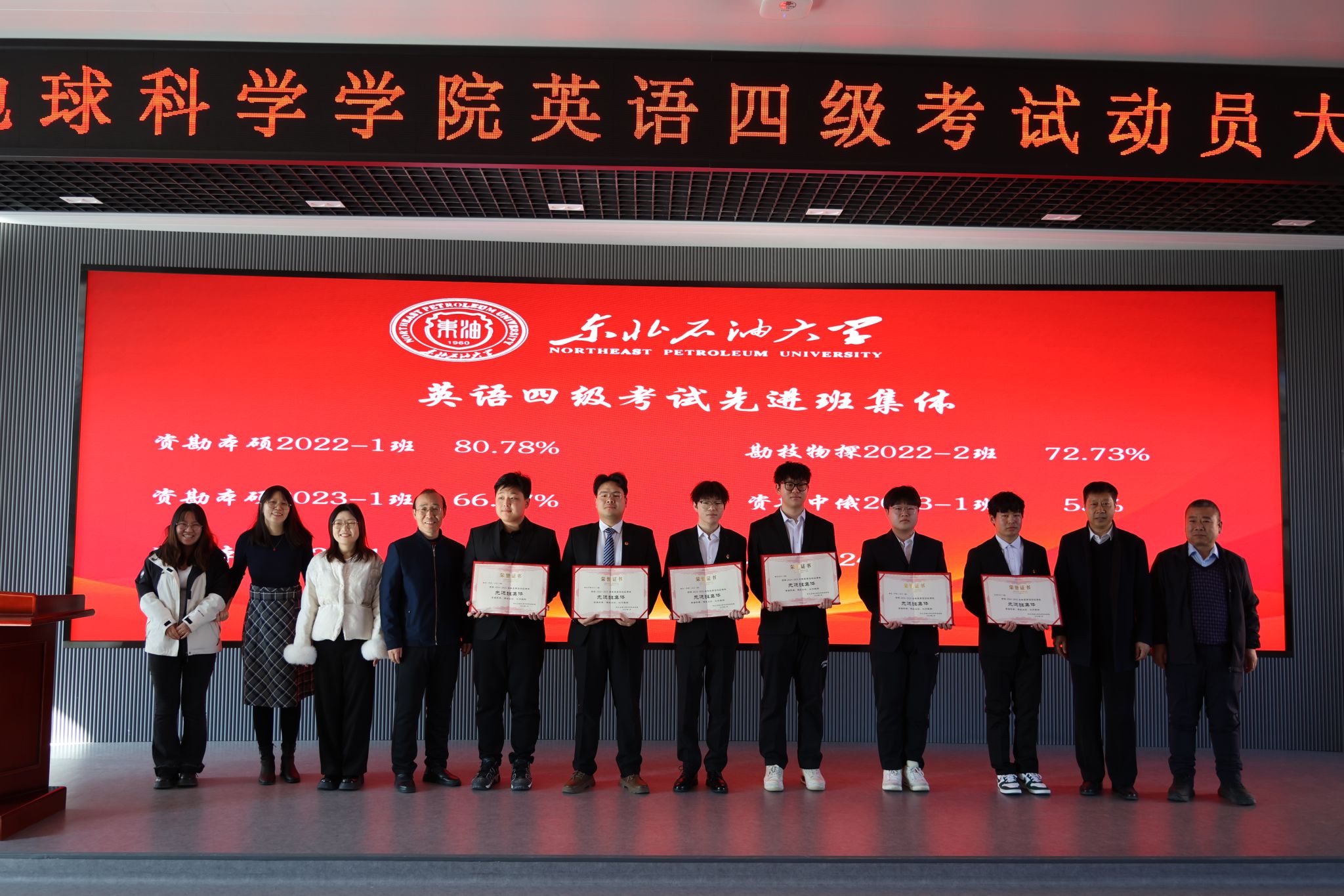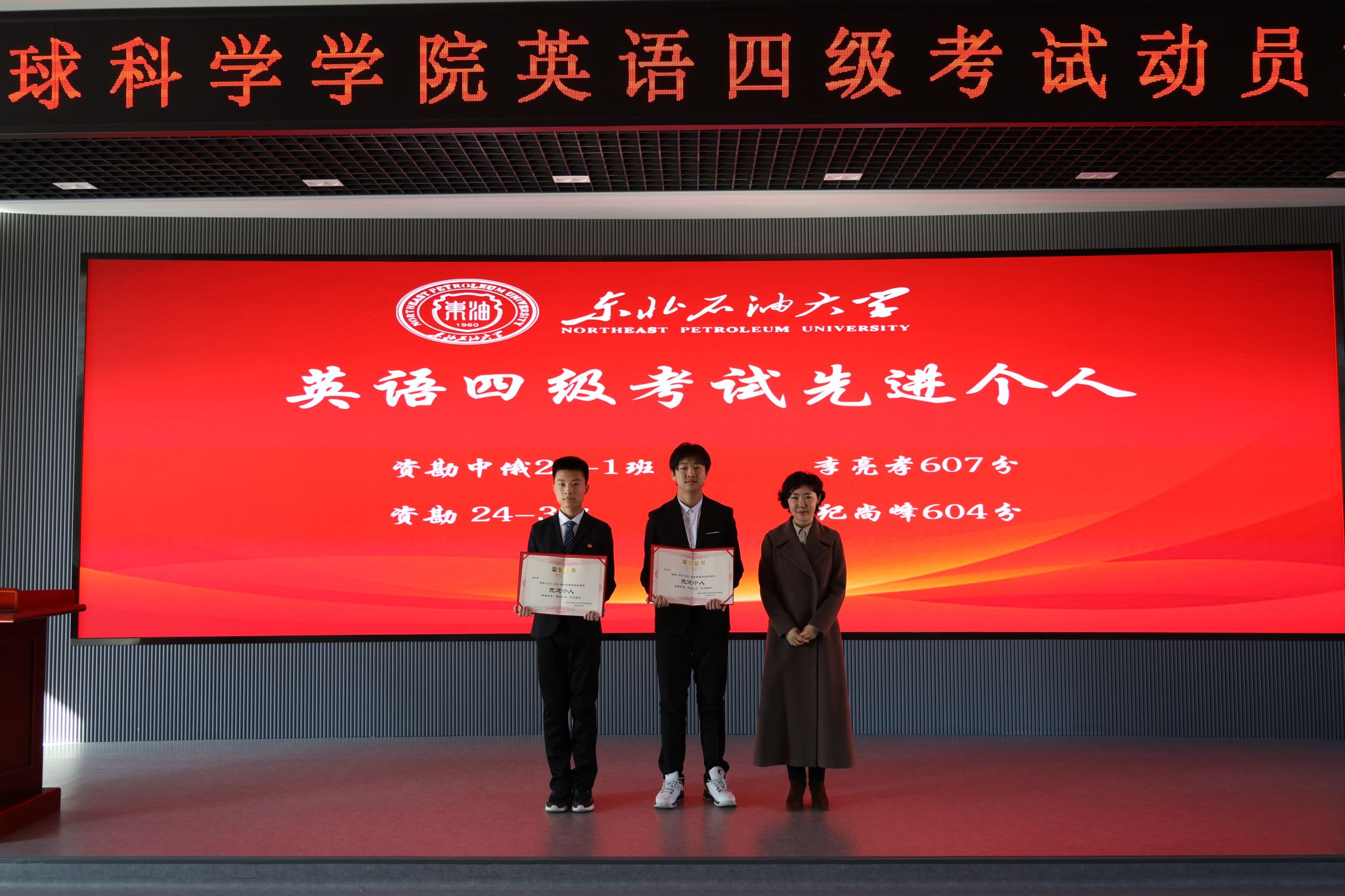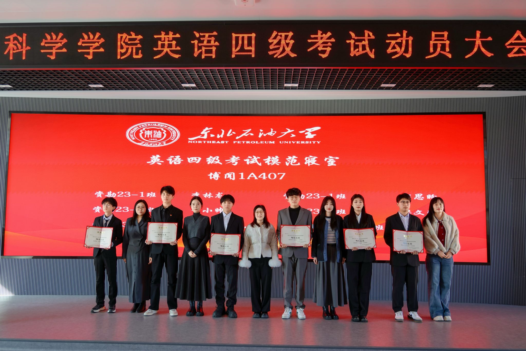 会上,学院表彰了在过往英语四级考试中涌现出的一批成绩优异的个人、学风优良的班级和互助共进的宿舍集体。激励更多同学以榜样为帆,在知识海洋中破浪前行。学院党委书记韦丹宁、获奖班级班主任、辅导员分别为英语四级考试先进个人代表、先进班集体代表、模范寝室代表颁发荣誉证书。
