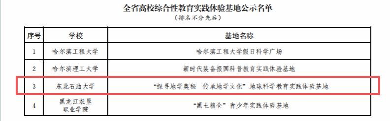 日前,黑龙江省教育厅公布“黑土铸魂”高校思想政治工作质量提升综合改革与精品建设项目入选名单,best365“探寻地学奥秘 传承地学文化”地球科学教育实践体验基地成功入选全省高校综合性教育实践体验基地。