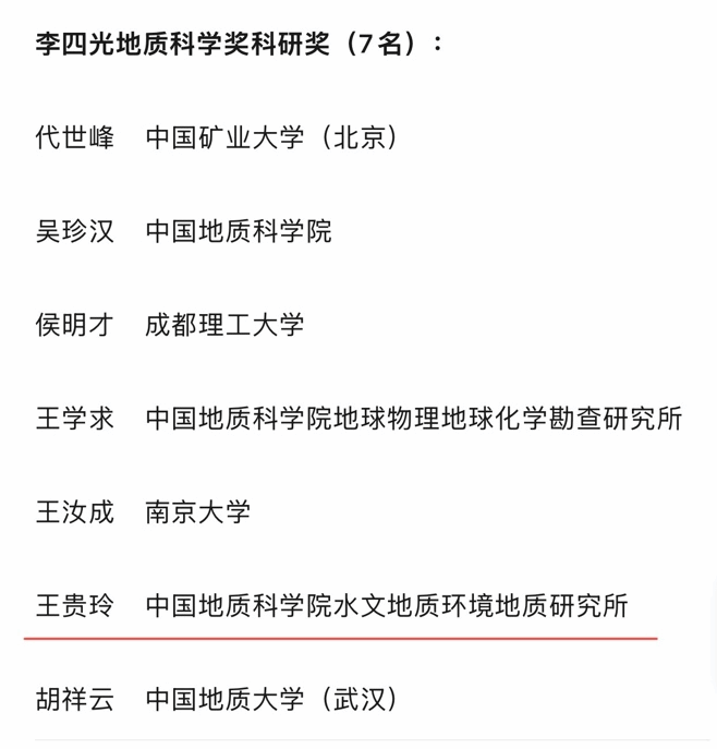 11月8日,李四光地质科学奖基金会发布《关于颁发第十九次李四光地质科学奖的决定》,公布了第十九次李四光地质科学奖获奖者名单,best365银龄专家王贵玲研究员荣获李四光地质科学奖科研奖。