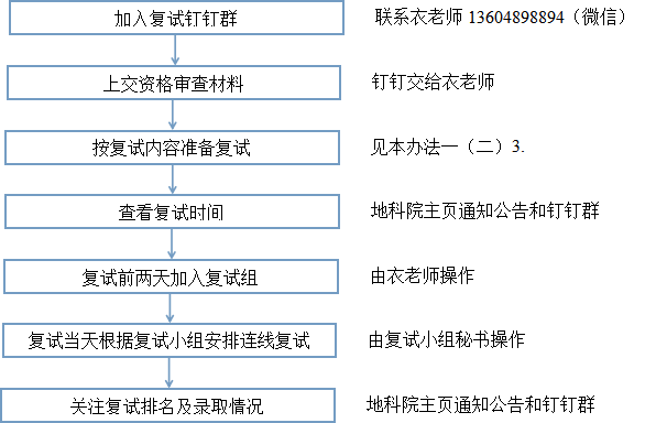 采取“钉钉”视频复试,复试前1-2天在地科院主页通知公告发布参加此次复试人员名单(一志愿名单由学校发布),名单确定后由衣老师将各位考生加入各复试小组钉钉群,复试当天随机确定考生复试次序,一人复试,一人准备,其余人候场,复试人数较多的专业可根据情况将学生分组,每组随机确定导师组组成人员,复试时专业知识考核时随机抽取复试试题。