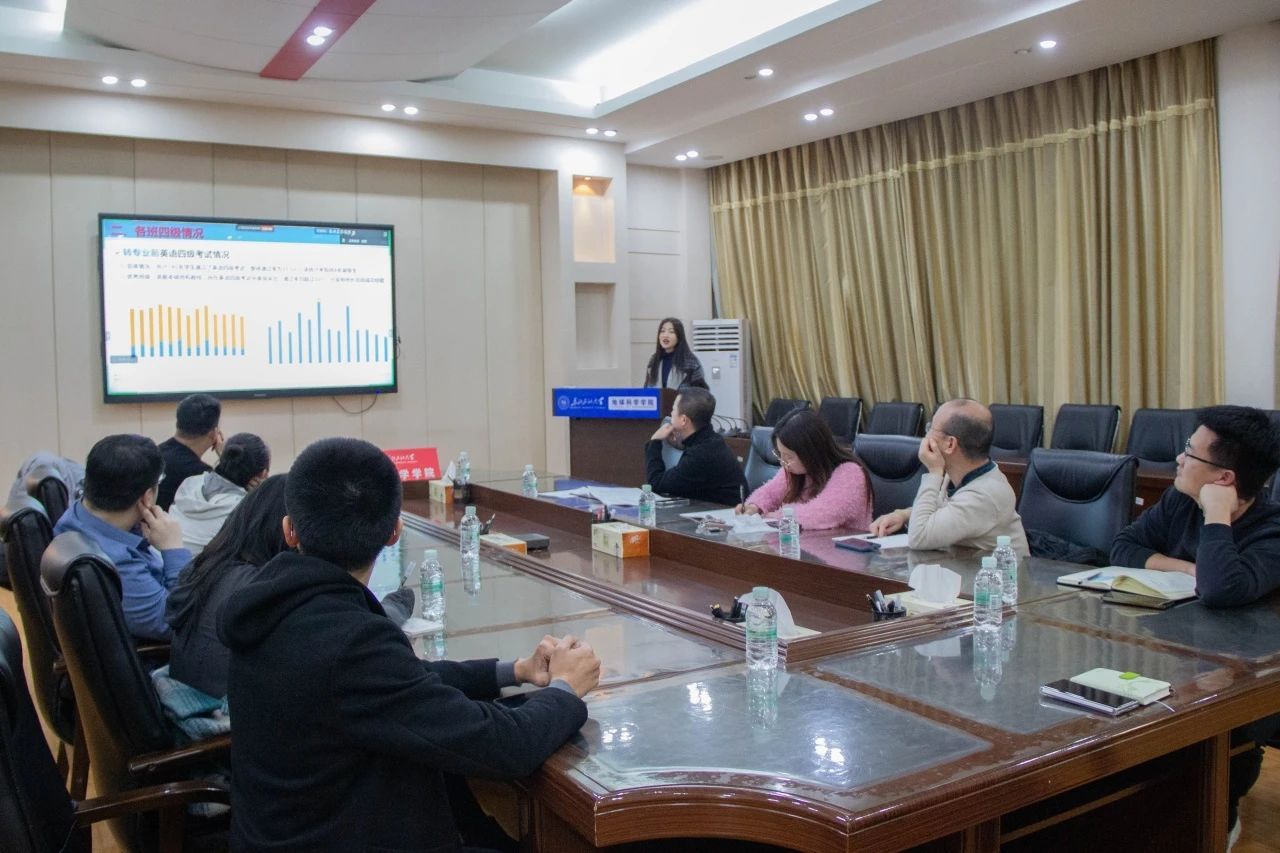 辅导员陈曦以2024级学生学业管理为重点,从四个方面展开学情分析:一是年级整体学生结构;二是英语四级考试结果及薄弱环节;三是学业预警学生分布特征;四是晚自习英语专项学习与晨跑考勤制度的具体要求。汇报结尾,她呼吁各位班主任要重点关注未通过四级考试和触发学业预警的学生群体,通过针对性帮扶、过程督导及家校协同等方式提升学业支持实效。